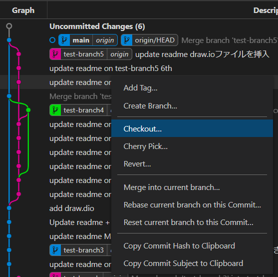 その他に右クリックからタグの付けたり、ブランチのマージなども行えます。
