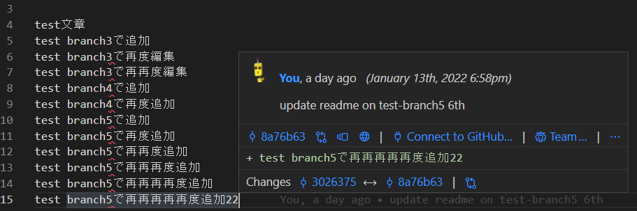 コードを行毎にカーソルをホバーするだけで、誰が変更したかを表示してくれます。