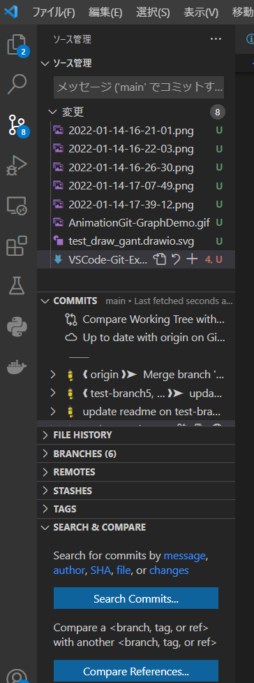 現在アクティブのファイルのコミット一覧が表示されます