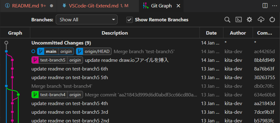 ブランチのごとにラインが表示されるので複数ブランチがある場合、視覚的に見やすくなります。